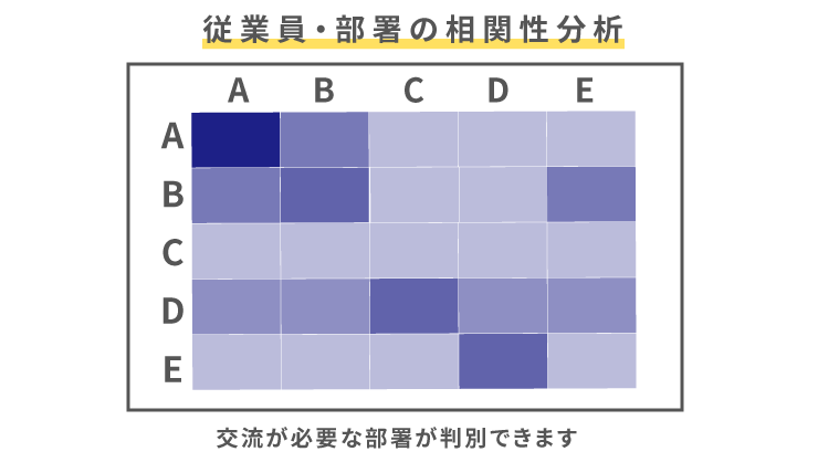 部署、個人ごとにどの様な関係性なのかをヒートマップで確認することができ、関係性の少ない部署への交流機会を設けることができます。
