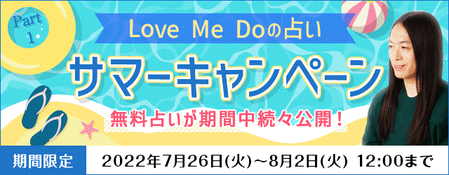 有名芸能人の結婚やスキャンダルから自然災害、政治・経済まで様々なニュースを的中させる『予言的中の占い師』Love Me Do。現在、月額公式サイト『ラブちゃん占い』にて、『Love Me Doの占い サマーキャンペーン』を開催中です。期間中、サイト内に新しく追加された人生占い・出会い占い・恋愛占いなどが、毎日1項目ずつ無料で鑑定できるお得なキャンペーンとなっております。ぜひこの機会にご利用ください。