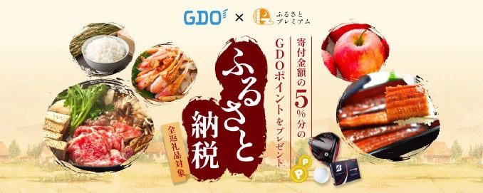 GDO会員ユーザーが「GDOふるさと納税」( https://www.golfdigest.co.jp/pcportal/furupre )を通じて参加自治体にふるさと納税の寄付を行うと、返礼品とは別に寄付額の5%相当のGDOポイントを付与します。