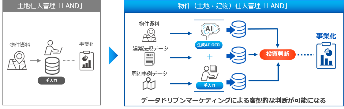 従来、ユーザー各社が保有しているPDFベースの物件情報をTASUKI TECH LAND上に登録するためには、1枚ずつすべての項目を手作業で登録画面上へ入力する必要がありました。日ごろ多岐に渡る業務に追われている仕入担当者には登録作業が負担となってしまう場面もあり、この登録作業が参入障壁となっていたことは、導入検討ユーザーやZISEDAIの開発組織内でも大きな課題と認識されていました。この課題の解決策として、OCRでの自動読取りサービスをオプション機能として実装いたしました。この機能を利用することで、毎日数多届く物件概要書や物件情報の登録も、入力工数を少なく実施することができます。