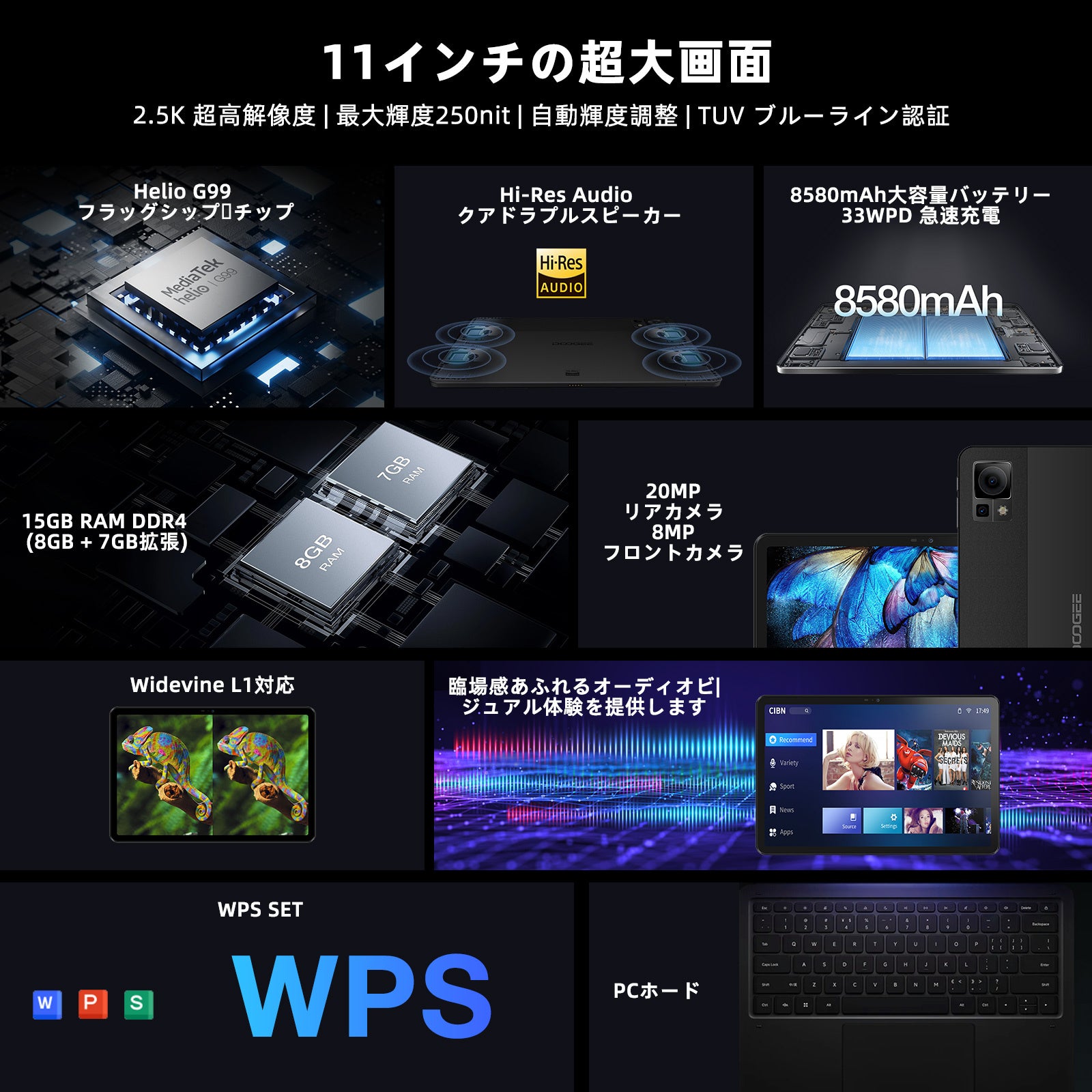 11 インチ+2.5K IPS in-cellディスプレイ、helio g99 2.2Ghz 8コア タブレット、15GB RAM +256GB ROM+2TB TF 拡張、4G LTE、20+8MP カメラ、8580mAh+33W PD急速充電