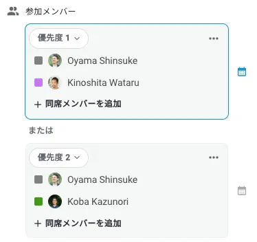 参加者のAnd/Or条件が指定できるため、「メンバーのうち誰か1人が参加する」「Aさんは必ず参加し、BさんとCさんのどちらか1人が同席する」「AさんとBさんどちらも空いている場合はAさんが参加する」などの柔軟なアサイン調整が可能になります。