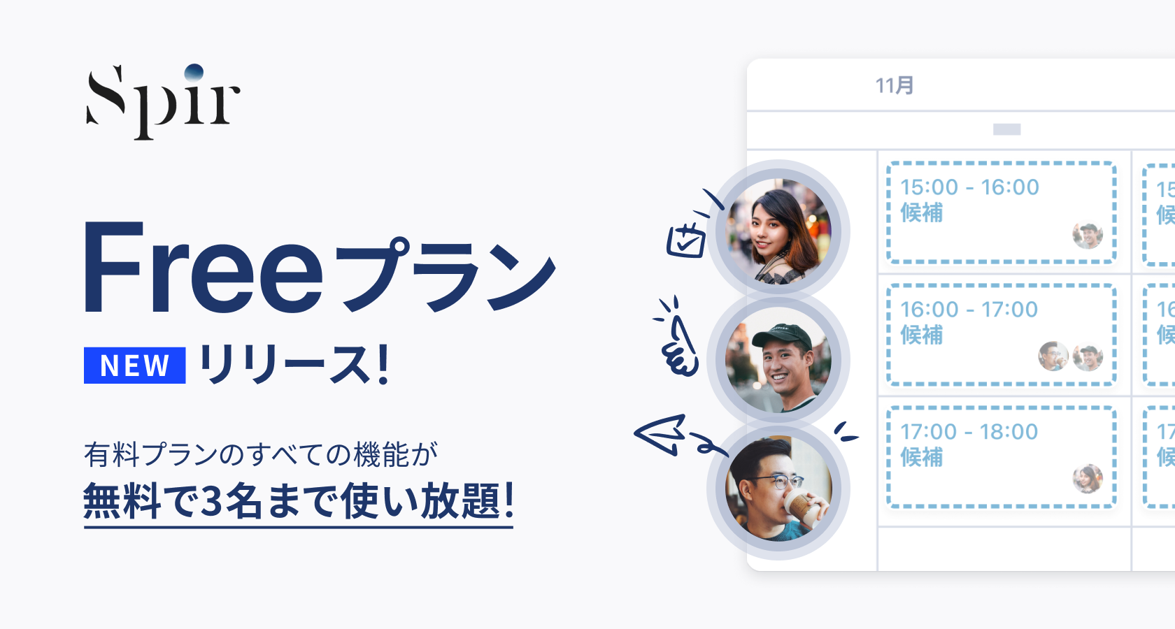 従来Spirでは1人で無料で使える個人プランを無料で提供してきましたが、複数人でより多機能な調整が行える機能についてはこれまで有料プランでの提供のみとなっていました。より多くのビジネスパーソンの皆様に複数人で連携する日程調整の利便性を体験いただくために、このたびFreeプランを新たに新設致しました。