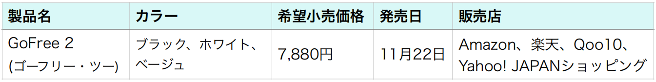 本製品の発売を記念し、11月22日(水)から12月1日(金)までの10日間、AmazonにてGoFree 2を含む弊社製品の特別セールを実施します。最大50%オフ、GoFree 2も28%オフという大変お求めやすい価格で提供いたしますので、ぜひご利用ください。