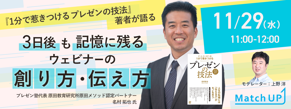 このセミナーでは、『デール・カーネギー流 1分で惹きつける プレゼンの技法』の著者である名村 拓也氏をゲストにお招きし、”視聴者を魅了し、記憶に深く根付かせるウェビナー”の創り方と伝え方を伝授いただきます。