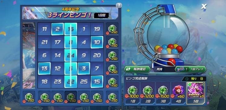 くじ引きマシーンで出た数字によって縦・横・斜めのいずれか5マスを揃えてビンゴを完成させると、新ファイターのバトルカードなどの報酬を獲得することができます。