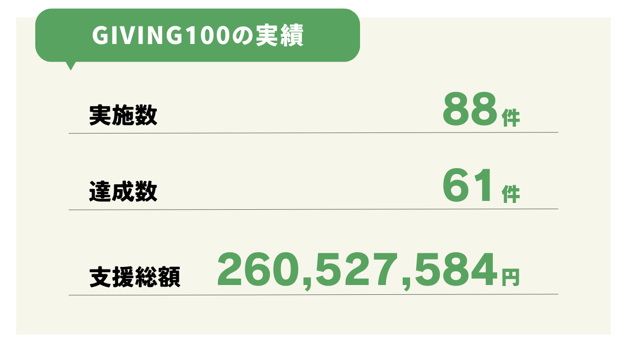 2022年1月の提供開始以降、GIVING100を適用したクラウドファンディングは88件、うち61件が目標金額を達成しました。支援総額は、260,527,584円にのぼります。