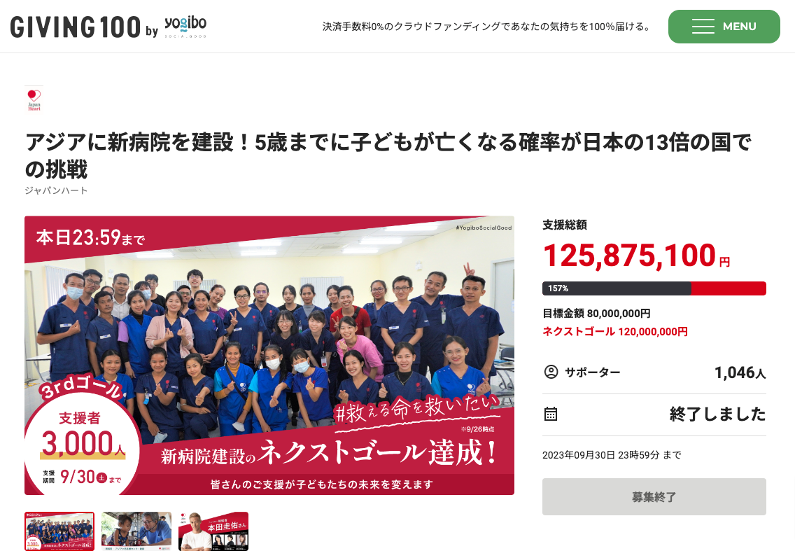 日本発祥の国際医療NGOである(認定)特定非営利活動法人ジャパンハート様は、国際的な無償の小児医療センター「ジャパンハートアジア小児医療センター」の2025年開設に向けて5月26日(金)~9月30日(土)に実施したクラウドファンディングにおいて、1,046名からの支援を受けセカンドゴールである1億2,000万円を達成しました。