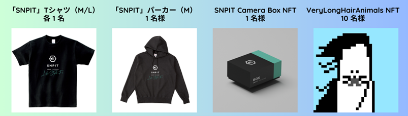 ゲストの吉田健一氏より、合計13名の方に豪華な視聴者プレゼントを予定。イベント終了後の参加者アンケートにご回答いただいた方を対象に「SNPIT」のオリジナルTシャツやパーカー、「SNPIT Camera Box NFT」に加え、吉田氏が独自に手掛けているNFTアート「VeryLongHairAnimals NFT」をプレゼントします。