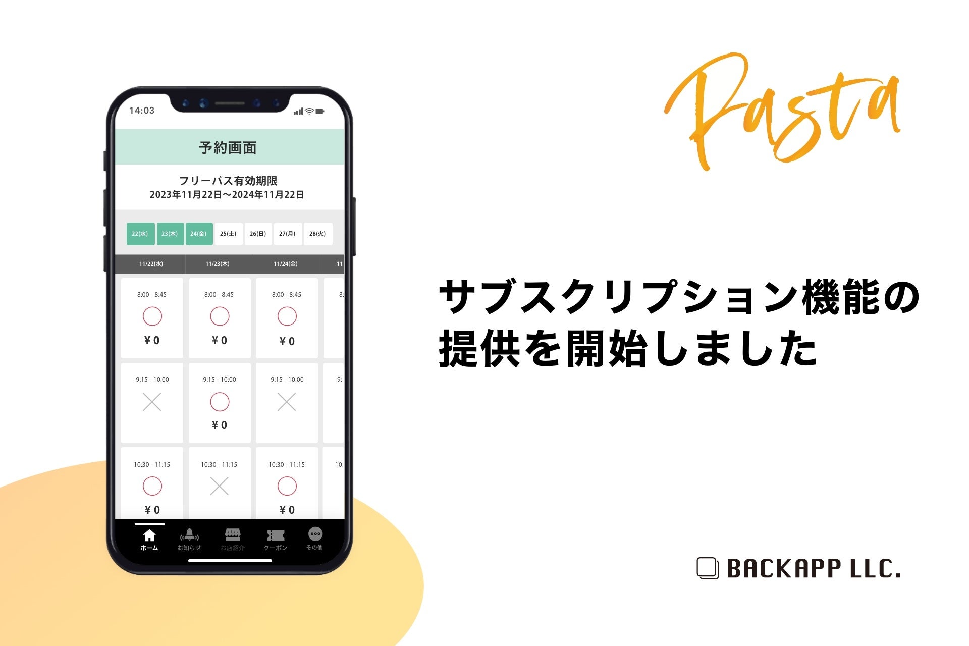 モバイルアプリ開発の合同会社バックアップ(所在地:千葉県習志野市奏の杜2-2-2-1315、代表社員:岡田耕治)は、アプリプラットホーム「Pasta」のサブスクリプション機能の提供を開始いたしました。