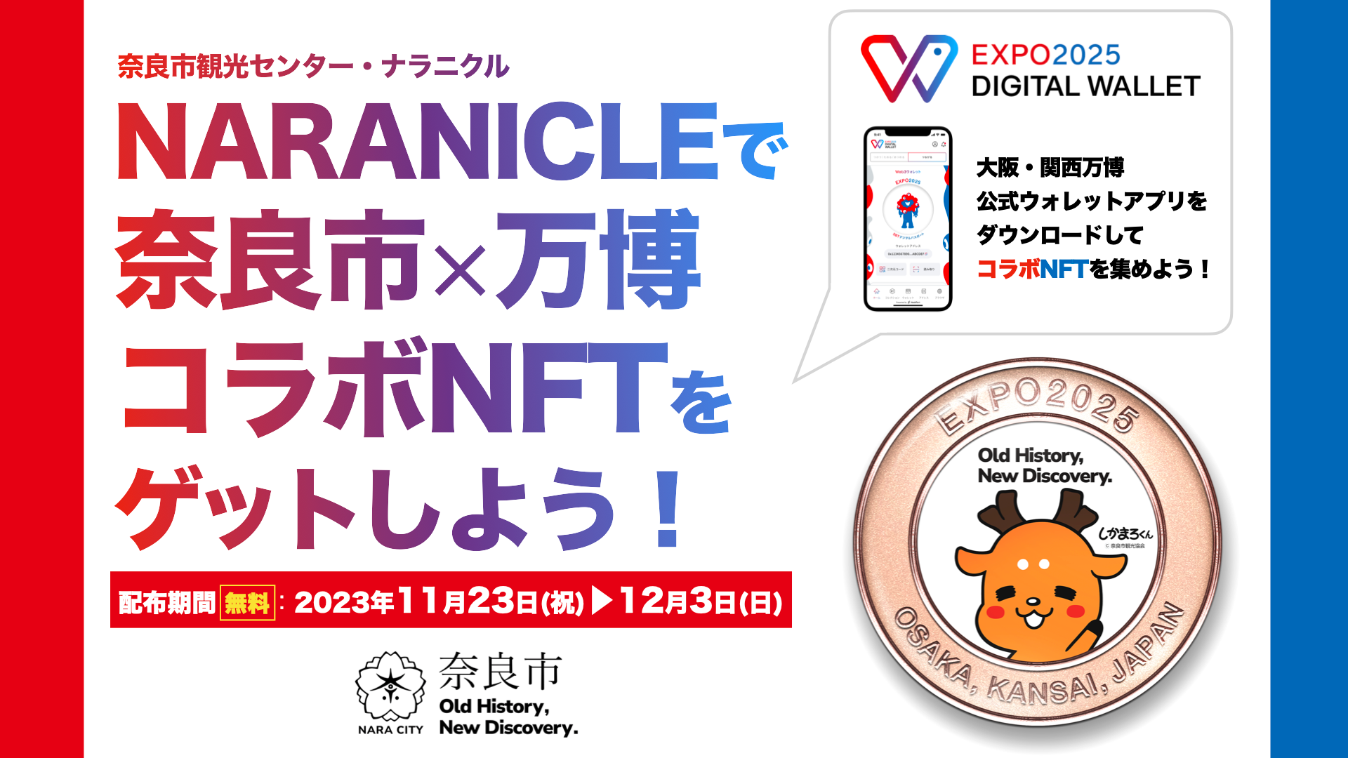 今回のコラボNFTは、2025年大阪・関西万博公式のウォレットアプリ「EXPO 2025 デジタルウォレット」の「つながる機能」を活用し、奈良市観光センター「NARANICLE(ナラニクル)」に設置する専用の二次元コードを読み取ることで獲得できます。