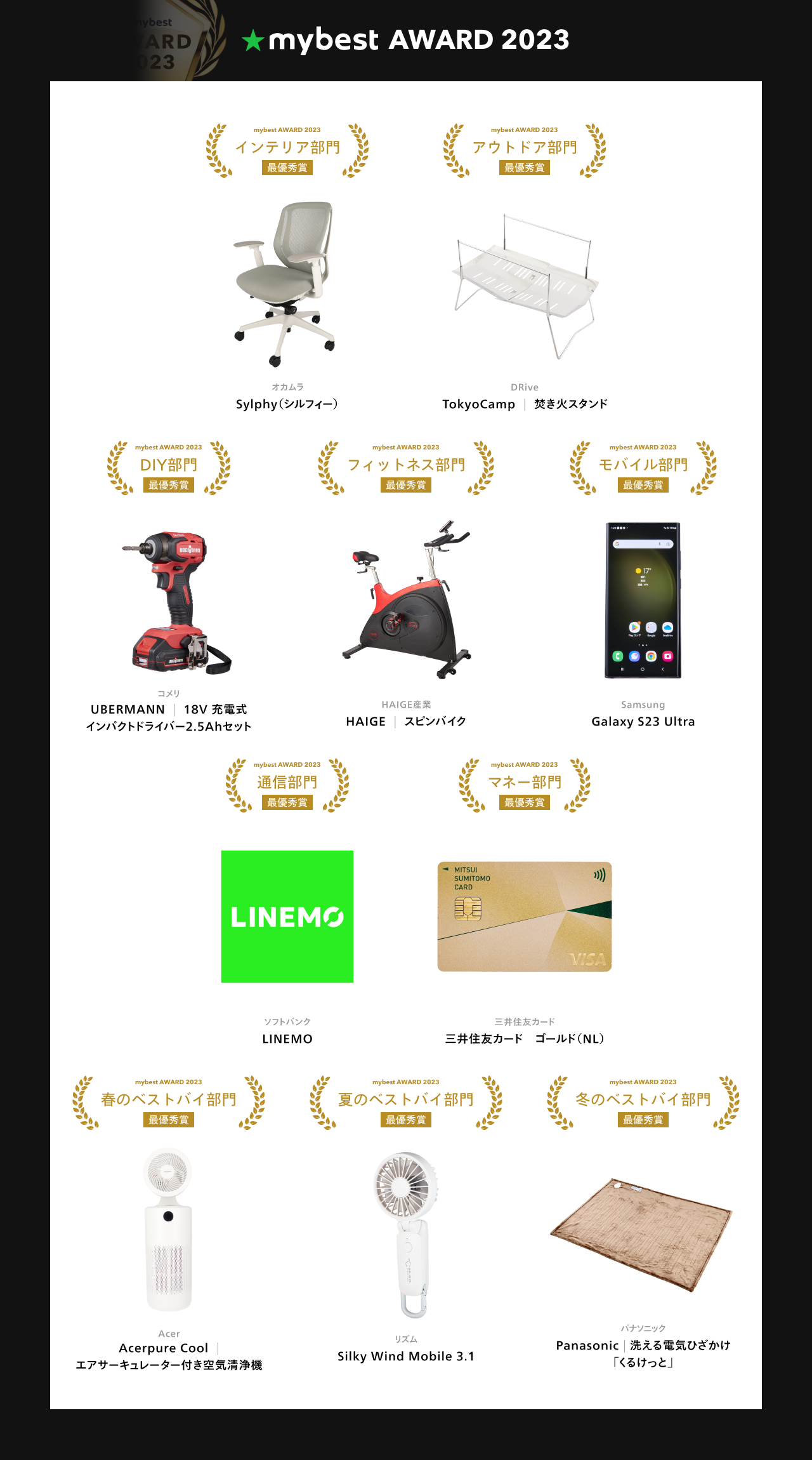 2023年1月1日〜2023年10月31日で、mybestのおすすめランキングで1位になった商品・サービスを候補としています。