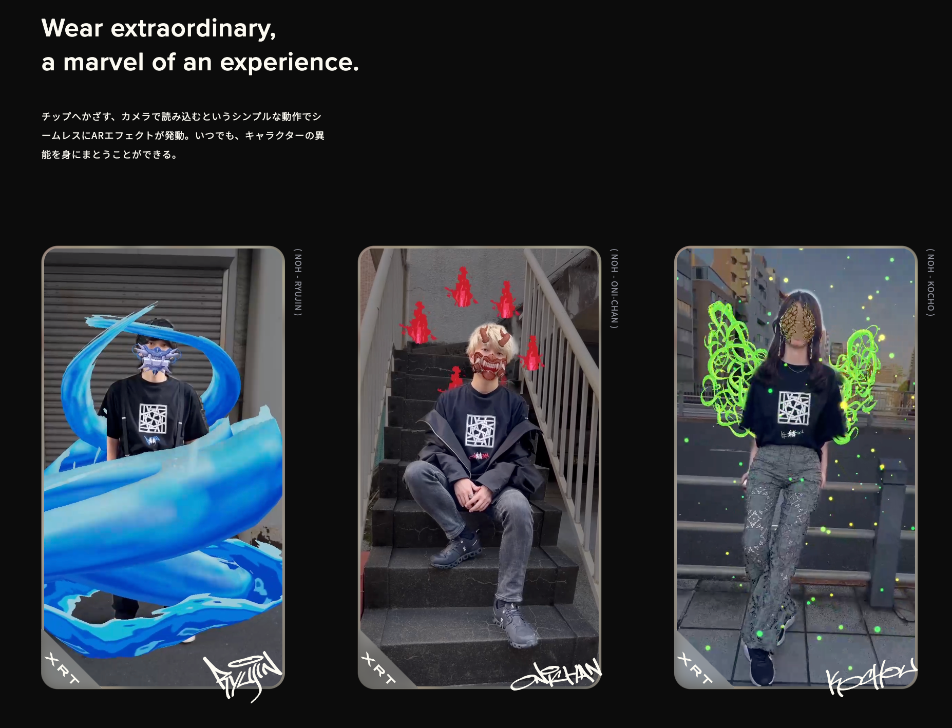 XRT規格を用いてHKSKが表現するオリジナルブランド。日本の伝統芸能である “能” の精神を背景に、3体のキャラクター『RYUJIN』『ONI-CHAN』『KOCHO』の特性に応じた異能を身に纏うことができます。XRコミュニケーションにより世界観を拡張するファッション新規格「XRT」の技術により構築され、デジタルアイテムとフィジカルアイテムが紐づくことで、次世代の自己表現の形を模索します。