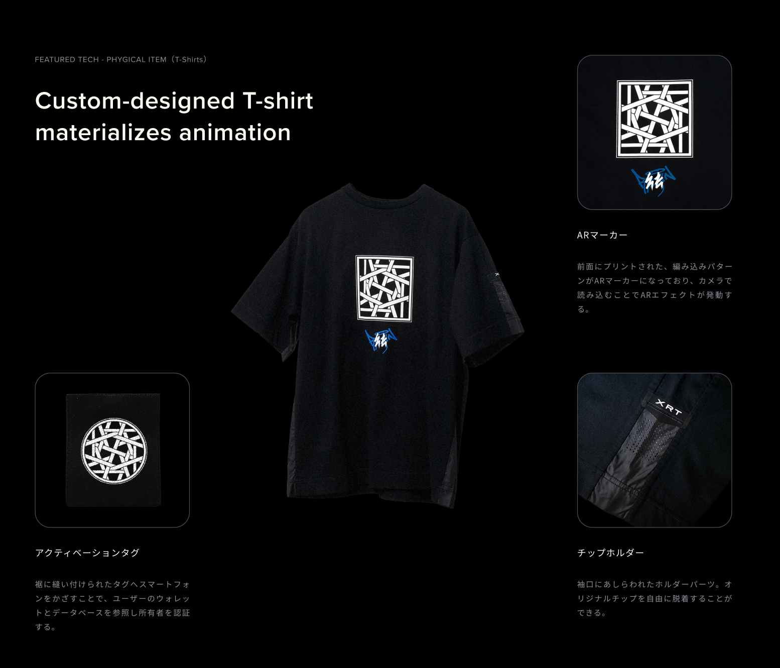 前面にプリントされた、編み込みパターンはARマーカーになっており、スマートフォンのカメラで読み込むことでARエフェクトが発動します。袖口にあしらわれたホルダーは、オリジナルチップを自由に脱着することができる仕様に。裾に縫い付けられたタグへスマートフォンをかざすことで、ユーザーのウォレット内のアイテムとデータベースを参照し所有者を認証します。