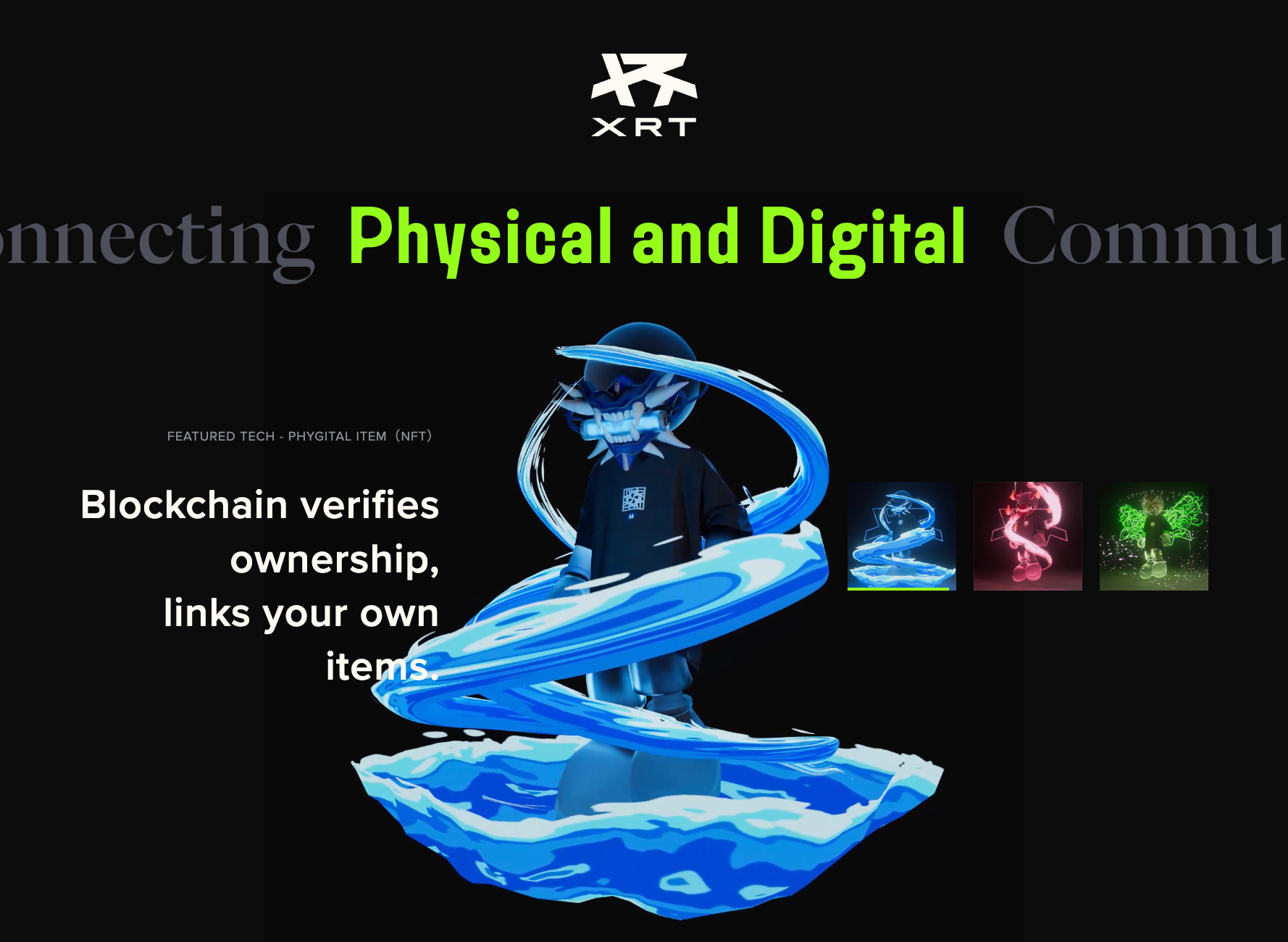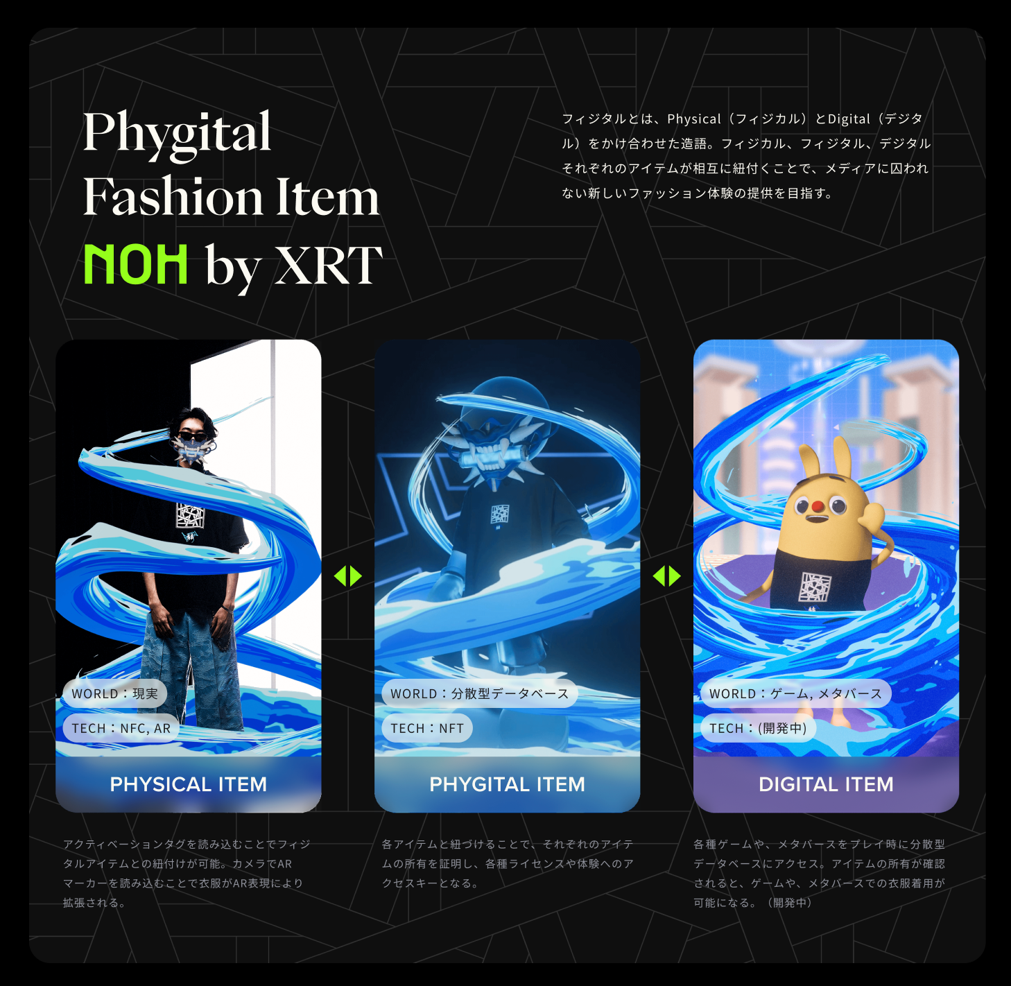 “フィジタル” とは、Physical(フィジカル)とDigital(デジタル)をかけ合わせた造語です。「XRT」とは、さまざまなIPやコンテンツの世界観を拡張するファッションにおける新規格。フィジカルなアイテムと、デジタルなアイテムを紐づけることで、それぞれの利用を可能にする「フィジタルアイテム」の所有を通じて、自己と他者・個々とコミュニティをつなぐ新たな手段を提供します。