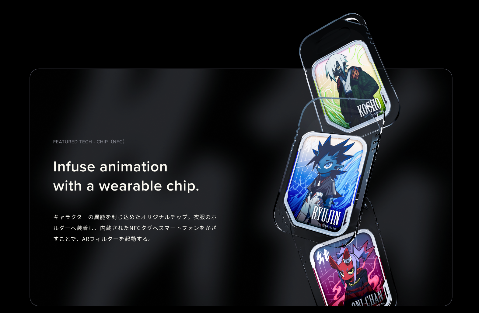 チップへかざす、カメラで読み込むというシンプルな動作でシームレスにARエフェクトが発動。いつでも、キャラクターの異能を身に纏うことが可能です。