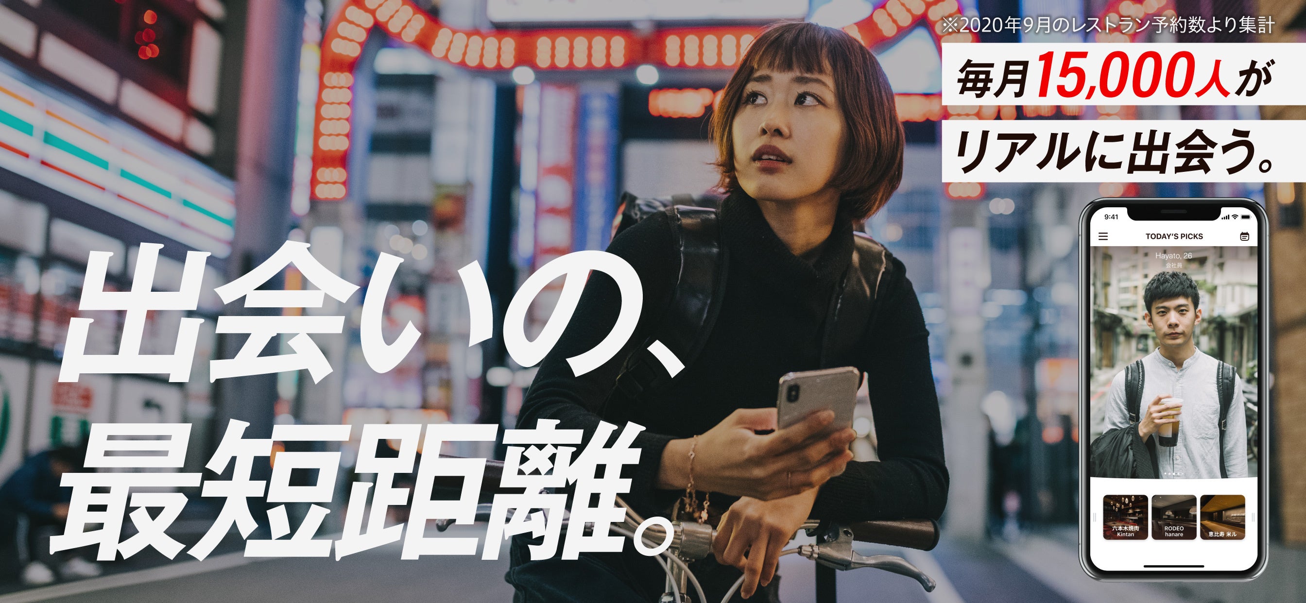 「出会いの、最短距離。」を掲げる第3世代の恋活・婚活マッチングアプリ。「人の魅力は実際に会ってみないと分からない」という考えのもと、面倒なメッセージのやり取りを省き、利用者同士の食事デートをアレンジ。日程調整や飲食店の予約まで全てアプリが自動的に行うため、利用者は気になるを選びマッチングするだけで、簡単にデートが実現できる。利用者の本人確認や、24時間体制の監視、ドタキャン対策など、安全面にも徹底的に配慮がなされている。