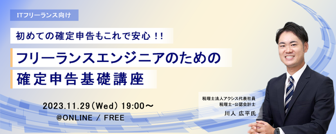 本セミナーでは、ITフリーランスエンジニアになって「初めて確定申告を行う方」「確定申告に不慣れな方」を対象に、確定申告について詳しく丁寧に解説します。ITフリーランスエンジニアになって間もない方や確定申告について不安な方など、是非ご参加ください。