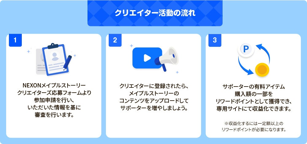 『メイプルストーリー』のプレイヤーは、お気に入りの「クリエイター」をサポート登録すると、そのクリエイターの「サポーター」になります。サポーター登録には料金はかからず、いつも通り『メイプルストーリー』をプレイしながら、ゲーム内で有料アイテムを購入した際、購入額の一部がサポート登録したクリエイターにポイントとして積立、還元されることによってクリエイターの活動支援につながります。