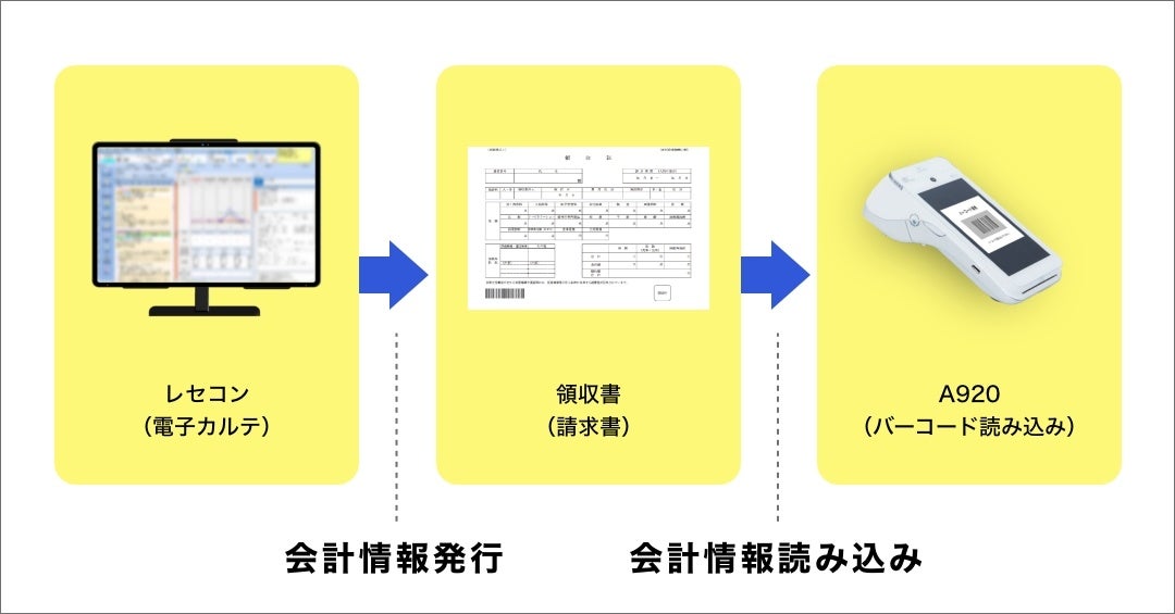レセコン(電子カルテ)から出力される診療明細や領収書に患者様負担金額が記録されたバーコードを「モバイル型決済端末 A920」に搭載されているカメラで読み込み、キャッシュレス会計を行います。そのため、以前まで金額の確認後にキャッシュレス端末に手入力していた工数が削減ができ、業務の効率化とヒューマンエラーの防止に繋がります。