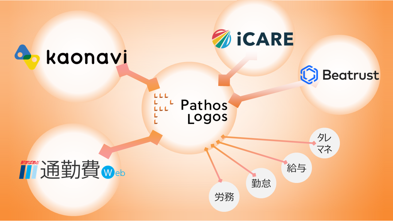 「PathosLogos」は、長年の人事業務に関するノウハウを集約し、「人」に関するデータを標準化しデータベースとして保持するサービスであり、機能レベルで各SaaSとデータ連携することが可能です。