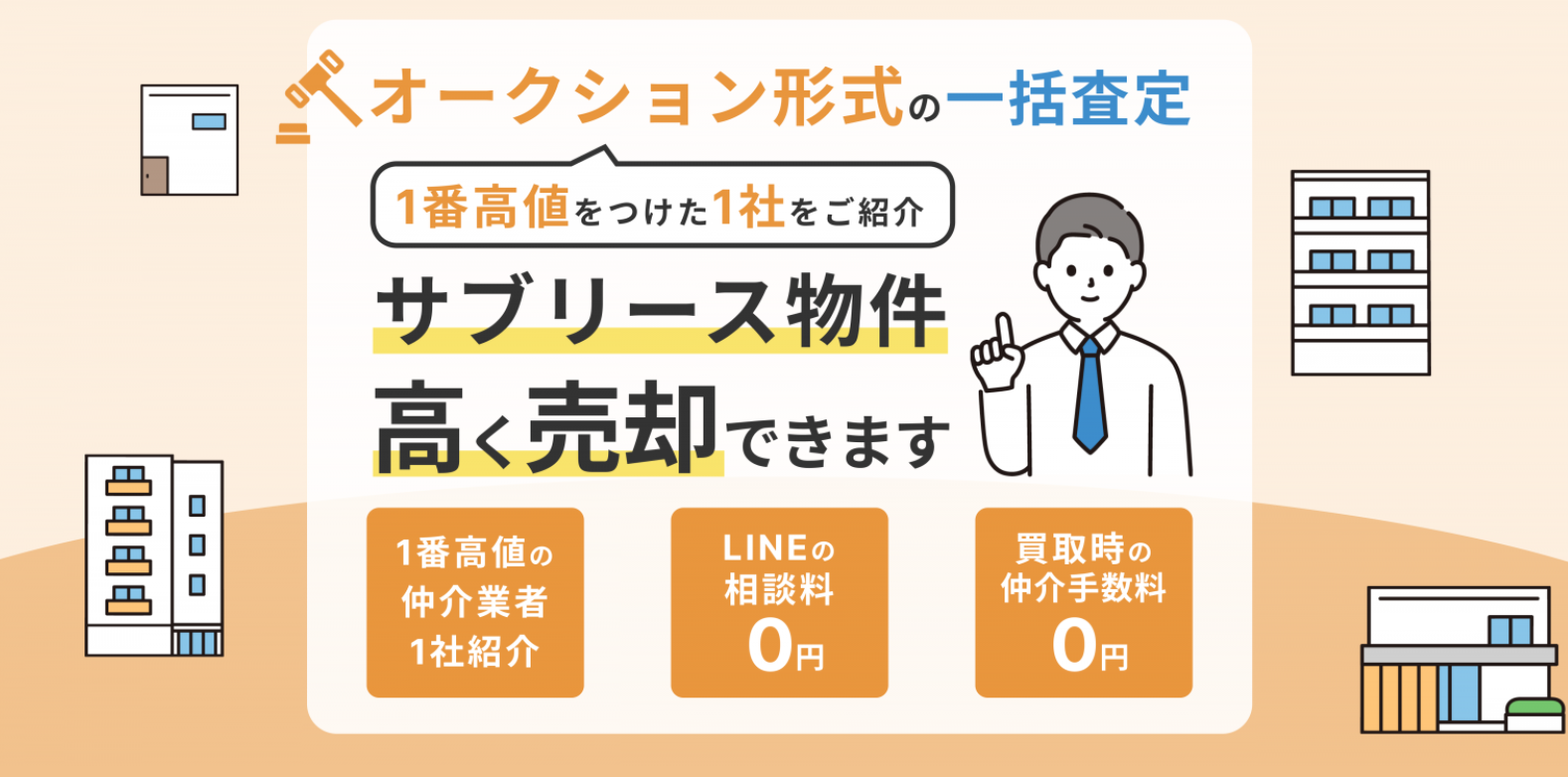 サブリース物件のオーナー様からの声を受け、オークション形式の一括査定で高値をつけた不動産仲介業者に物件を売却できるサービスを開始するに至りました。相談・仲介業者の紹介・売却に手数料がかからない無料サービスです。