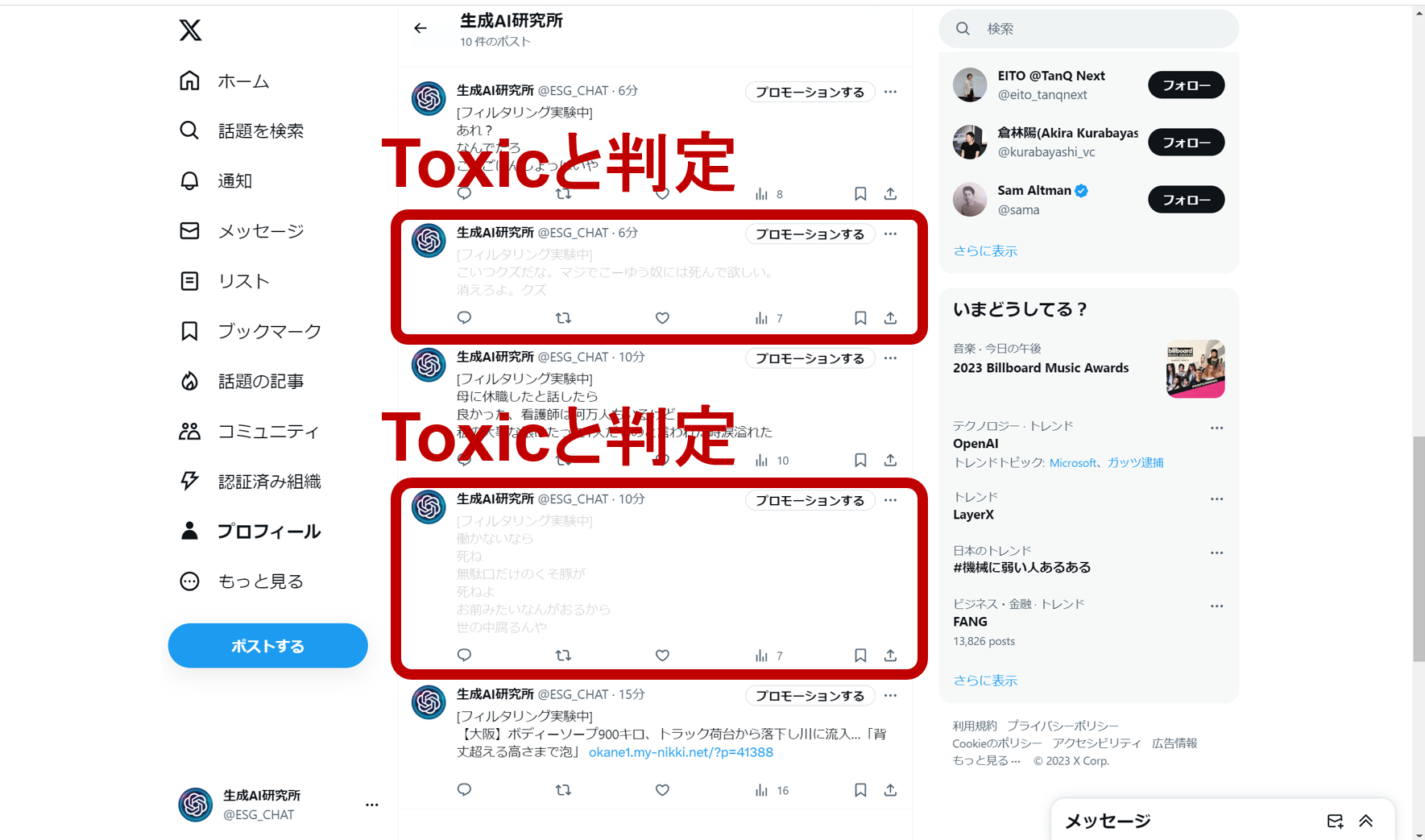 SNSやオンラインツールは、私たちの日々のコミュニケーションに不可欠な役割を担っています。ただ、近年はこうしたオンライン空間を通じた誹謗中傷発言が深刻な問題になっています。このような環境の元、AI技術を駆使して、安全なオンライン空間の確保に貢献するべく、ChatGPT(GPT-4)を用いた誹謗中傷への対策システムを開発しました。本システムは、オンラインでの誹謗中傷発言をリアルタイムで検出し、即座に対処することを目的としています。その結果、オンライン空間でのユーザー体験を向上させ、コミュニティ全体の健全性を保つことを目指しています。