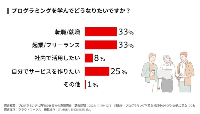 次に「プログラミングを学んでどうなりたいか」を聞いたところ、同率1位で「転職/就職」と「起業/フリーランス」が33%という結果でした。「自分でサービスを作りたい」は25%、「社内で活用したい」は8%でした。