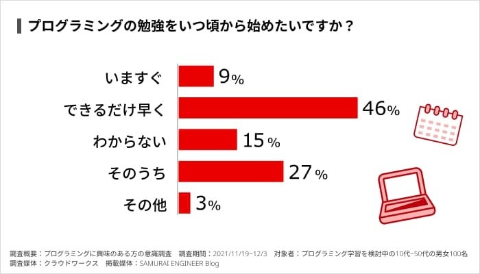 プログラミング学習を検討している10代〜50代の男女100名を対象に、「プログラミングをいつ頃から始めたいか」を聞いたところ、「できるだけ早く」と回答した人が最も多く46%、次いで「そのうち」が27%、「わからない」が15%、「いますぐ」が9%という結果でした。