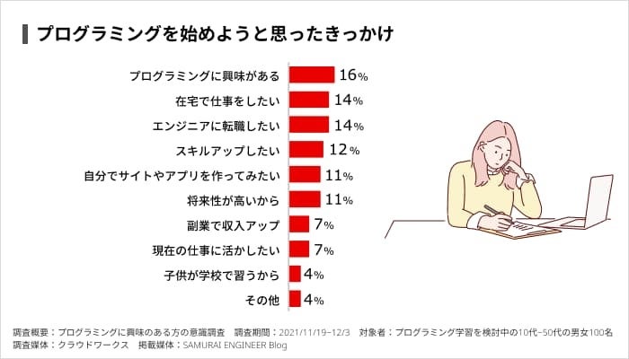 「プログラミングを学び始めようと思ったきっかけ」を聞いたところ、10%を超えた回答は「プログラミングに興味がある」「在宅で仕事をしたい」「エンジニアに転職したい」「スキルアップしたい」「自分でサイトやアプリを作ってみたい」「将来性が高いから」という理由が並びました。