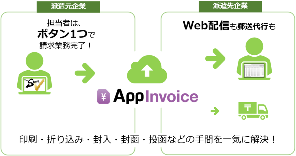 「AppInvoice」は、これまでの請求書印刷に加え、電子化したデータを、お客様に電子メールで送付する機能や、電子メールが利用できない場合は、印刷したデータを封入・封函して郵送することも行えるものです。「AppInvoice」を活用することにより、人手に頼っていた、印刷、封入、封函、郵送という煩わしい一連の作業を削減することや郵送費も抑えることができます。