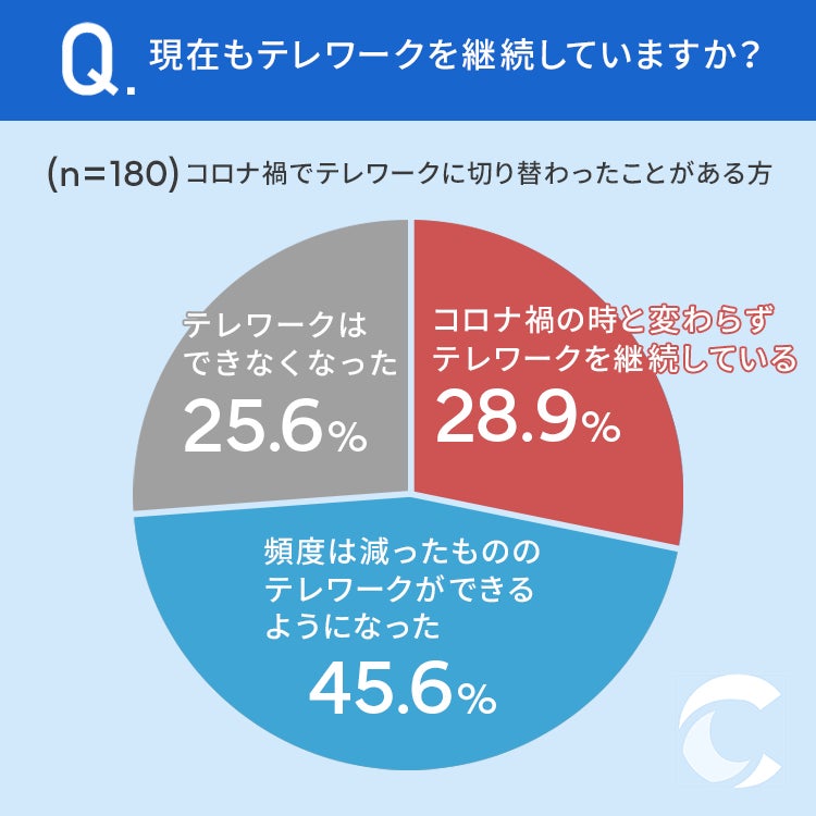 28.9%の方が「コロナ禍の時と変わらずテレワークを継続している」、45.6%の方が「頻度は減ったもののテレワークができるようになった」、25.6%の方が「テレワークはできなくなった」と回答しています。