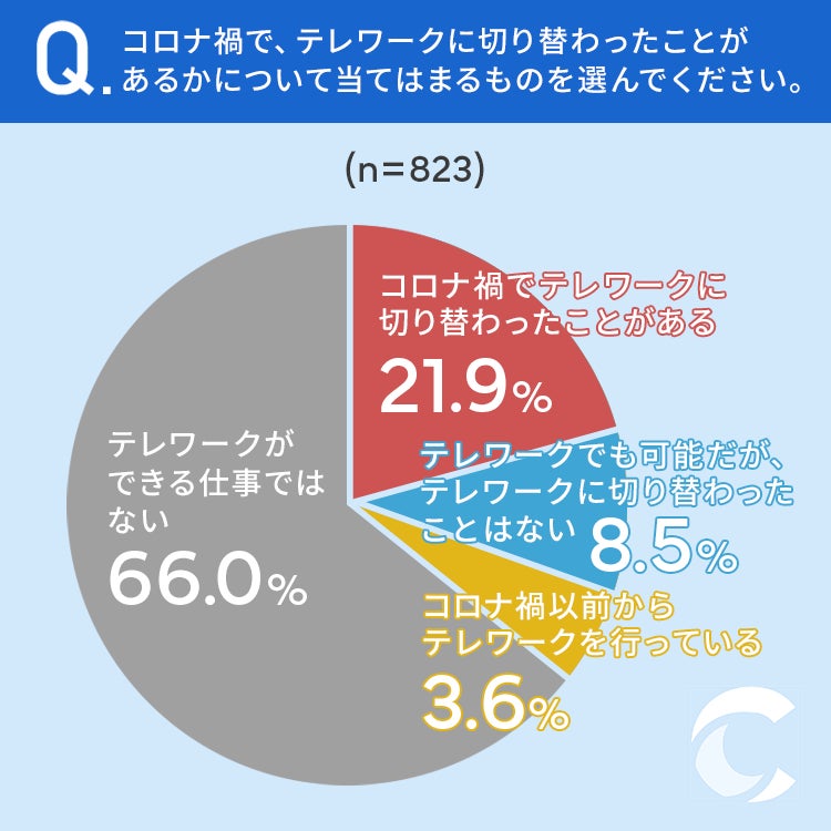 そこで今回は、事前調査で「現在会社に勤めている」と回答した全国の男女823名を対象に「コロナ禍以降のテレワーク定着」についてアンケートを実施しました。