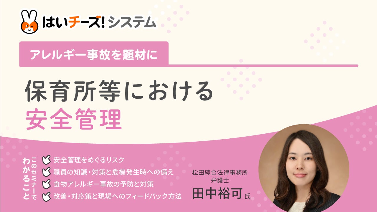 オンラインセミナーでは、松田綜合法律事務所の田中先生を講師にお招きし、安全管理のリスクや危機発生時の備え、食物アレルギー事故の予防と対応などについて、事例を取り入れながら詳しくお話いただきます。