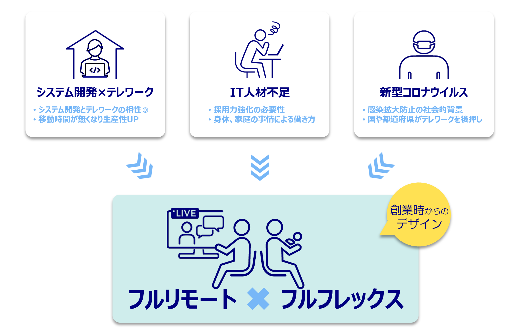プログレスはシステム開発とテレワークの相性の良さ、求められる働き方の変化、新型コロナウイルスといった背景からフルリモート×フルフレックスの会社を設立しました。