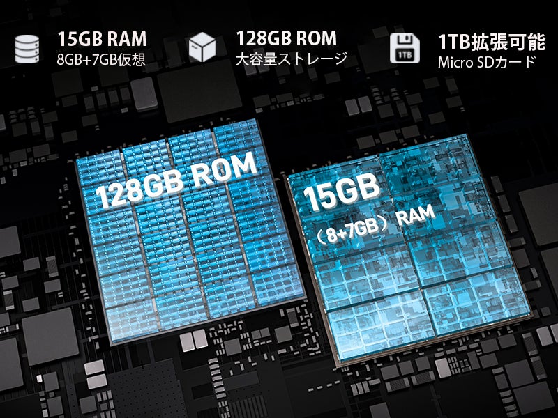 8GBのメモリ+7GBの拡張可能な仮想メモリ、合計15GBの融合メモリを搭載しています。これにより、タブレットは複数のアプリケーションを簡単かつスムーズに切り替えることができ、ラグをなくし、高速でスムーズな操作体験を提供します。128GBの大容量ストレージも搭載されているため、メモリ不足を心配する必要はもうありません。 大容量の1TBまでのmicroSDカードでストレージ容量をさらに拡張できます。(FAT32、exFATフォーマットカードは別売り)