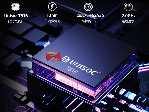 UNISOC T616は2つのArm Cortex-A75ハイパワ口アと6つのCor- tex-A55 インテリジエント AI コアを搭載しています。性能とエネルギー効率のより良いバランスを提供します。 先進的な12nm(ナノメートル)プロセスにより、電力効率とパフォーマンスを向上。 スムーズな操作感を提供します。