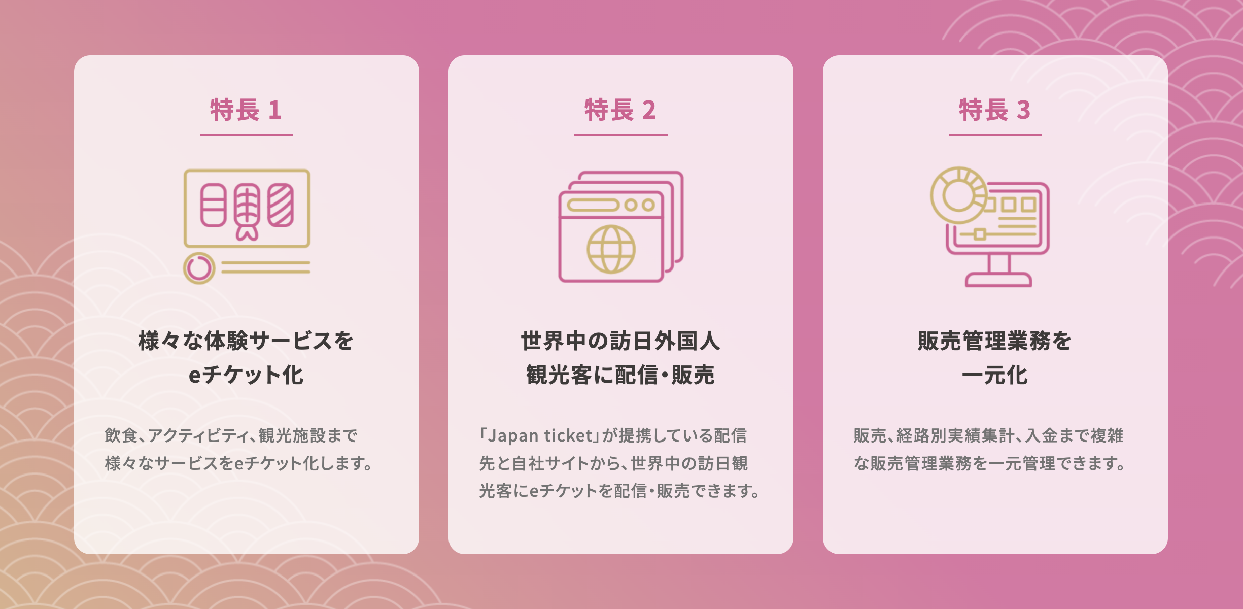 「Japan ticket」は、それら多くの魅力ある日本の体験サービスをeチケット化し、世界中の訪日外国人観光客が利用する海外プラットフォームや自社ホームページ・SNSで配信することで、インバウンド集客を最大化することを可能にします。