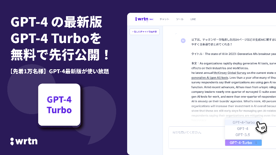 この機会にぜひ、GPT-4 Turboでより快適になる生成AIサービス 「wrtn(リートン)」 をご体験ください。
