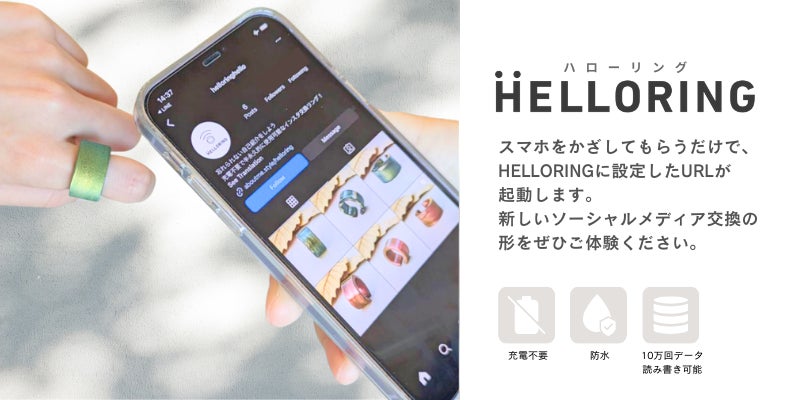 HELLORINGは、スマートフォンに触れるだけでInstagram、LINE、Litlink、Youtubeなどのプロフィール情報や任意のURLを交換できる指輪です。充電の必要がなく、防水仕様で半永久的に使用可能。ご自宅でお湯に10秒つけるだけでサイズ調整も可能です。HELLORINGは新しい挑戦をする人々を応援するために、「はじめましてに、ワクワク」するような体験を提供することを目指しています。