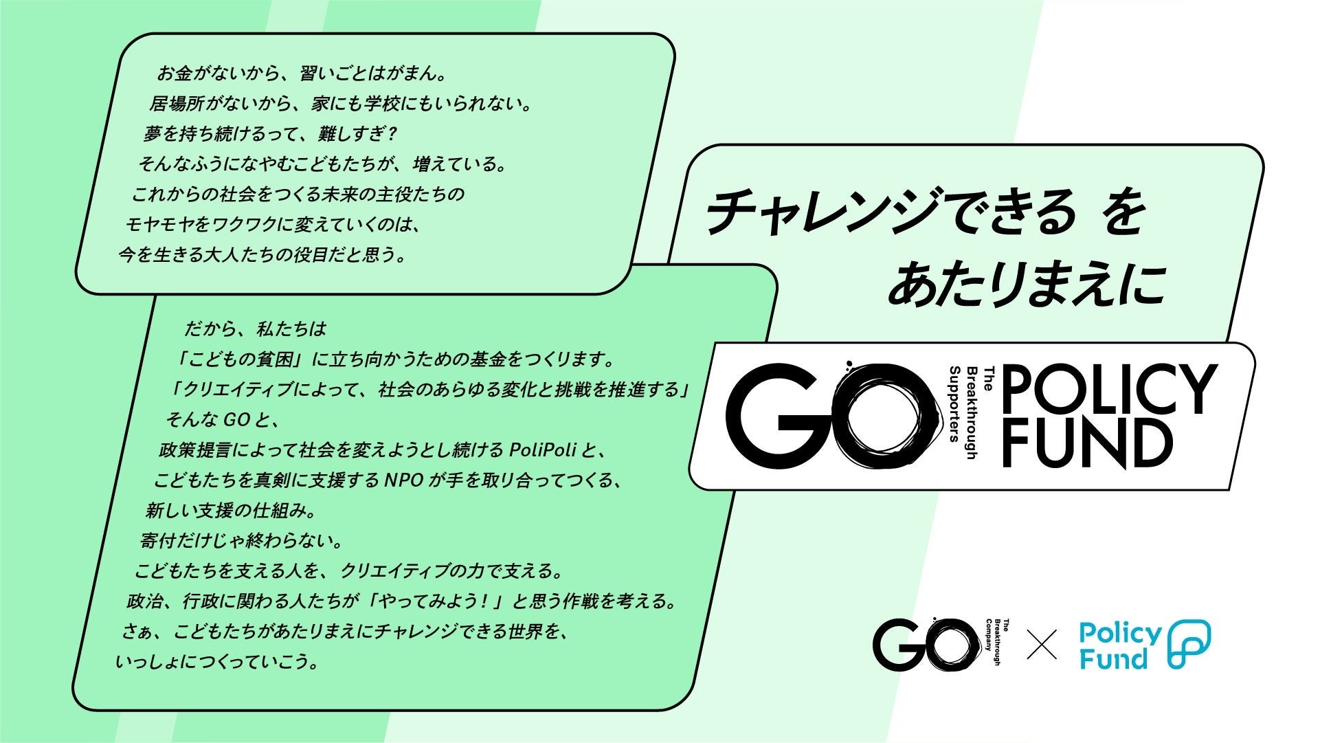「GO POLICY FUND」は、PoliPoliと、企業のブランディングや事業成⻑⽀援を幅広く⼿掛けてきたGOのアセットを掛け合わせて、こどもの問題解決に取り組むNPO等の⽀援を⾏う新しい形の寄付基⾦です。