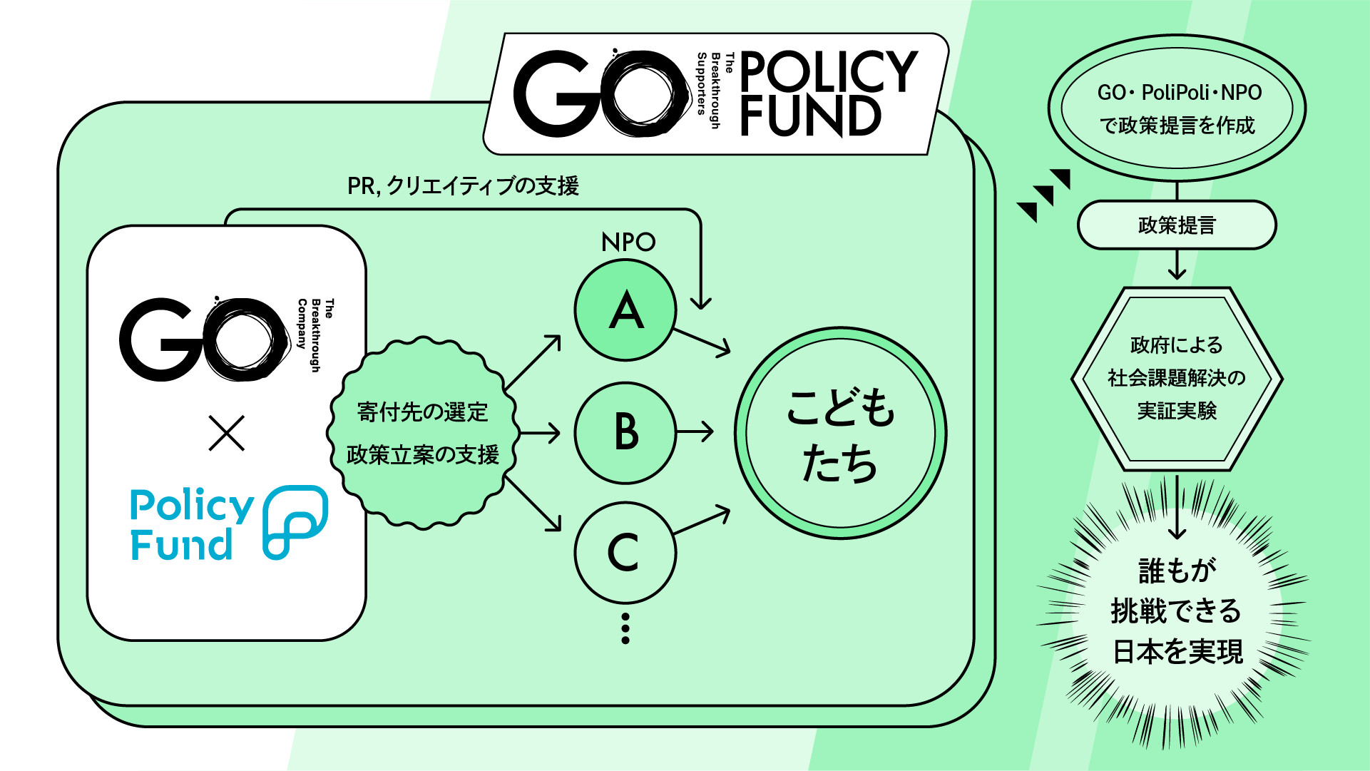政策を軸にした、社会課題解決を加速するための寄付基金「Policy Fund」等を運営する株式会社PoliPoli(所在地:東京都千代田区、代表取締役:伊藤和真、以下PoliPoli)は、The Breakthrough Company GO(東京都港区、代表取締役、三浦崇宏・福本⿓⾺、以下GO) と、こどもの貧困問題を解決するための寄付基⾦「GO POLICY FUND」を設⽴したことをお知らせします。