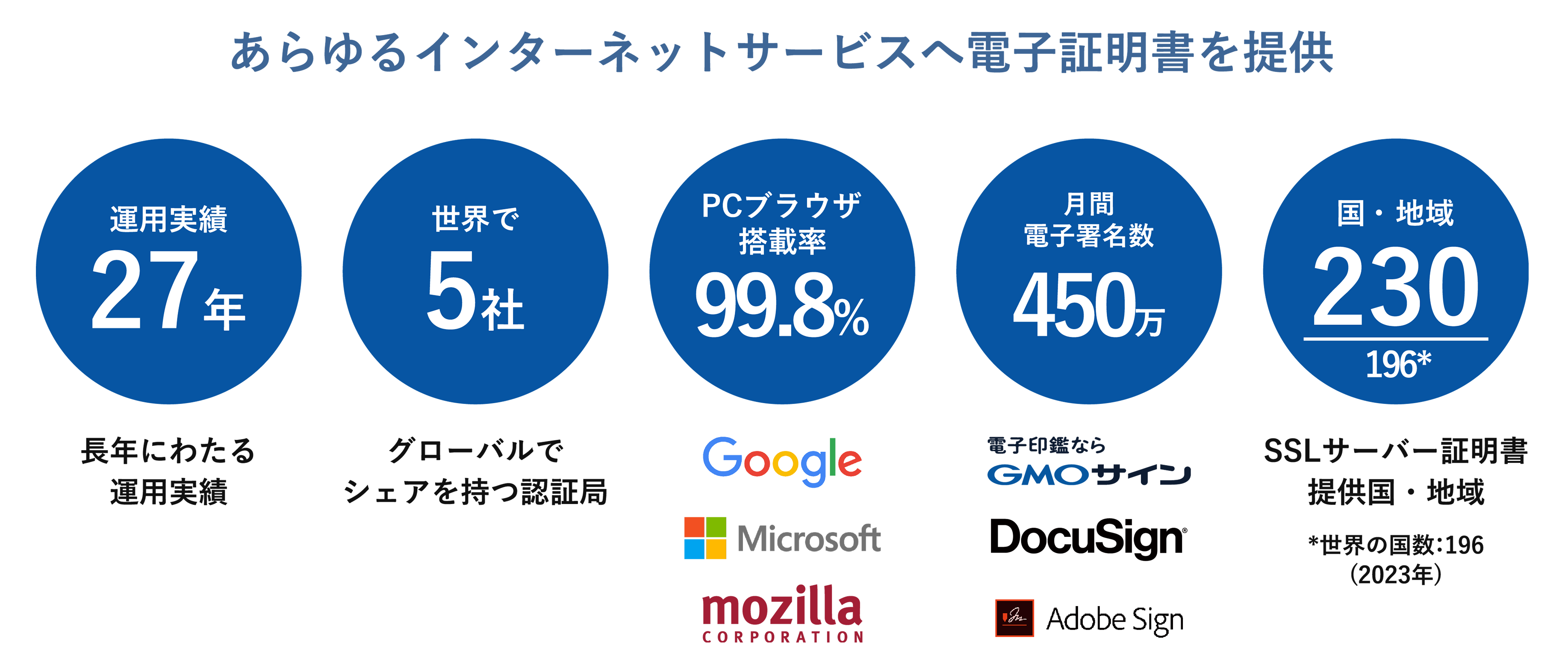 グローバルでシェアを持つ世界トップ5社(※2)の中で唯一の国産認証局「GlobalSign」を保有しており、国内外の主要な電子契約・署名ベンダーへ認証技術を提供。また自社開発で導入企業数300万社以上(※3)の「電子印鑑GMOサイン」との連携により、コストパフォーマンスの高いセキュアなサービスを多くの自治体・企業様等にご利用いただいております。