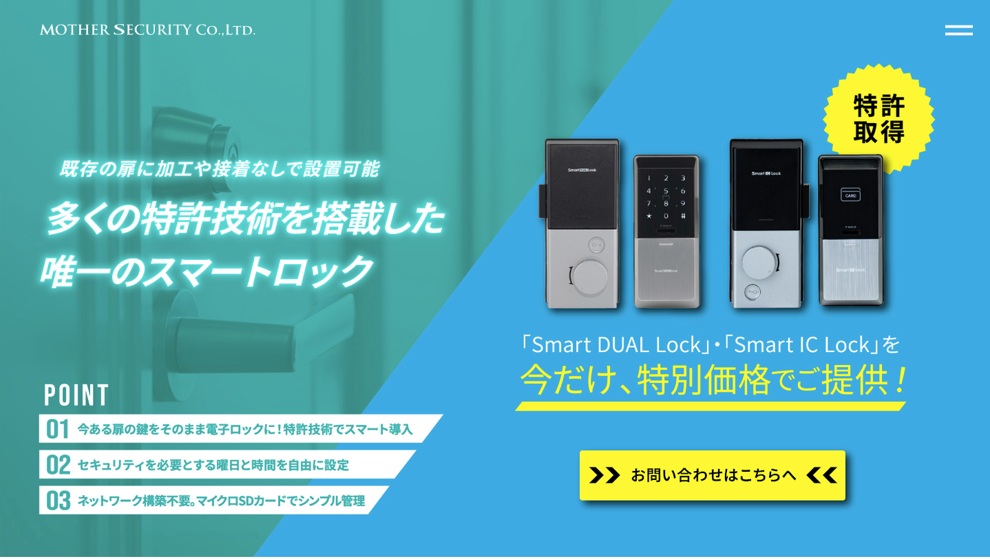 マザーセキュリティのグループ企業「株式会社シーズンテック」は、業界のリーディングカンパニーとして独自の特許製品を生み出し続けており、電子錠業界で20年超の実績があります。そのノウハウや技術を集結させた次世代電子ロック製品を提供しているのがマザーセキュリティ。「スマート」、「安心」、「便利」なマザーセキュリティ品質をお届けします。