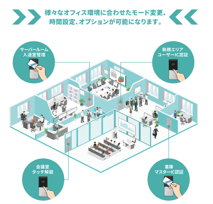 「認証不要、誰でも入室可能な常時解錠モード」、「登録したICだけが入室可能な認証モード」、「管理者だけが入室可能な常時施錠モード」という3つのモードを曜日と時間別に設定できます。例えば出入りの激しい時間帯は認証無しにするなど、働き方や人の流れに合わせた設定が可能です。