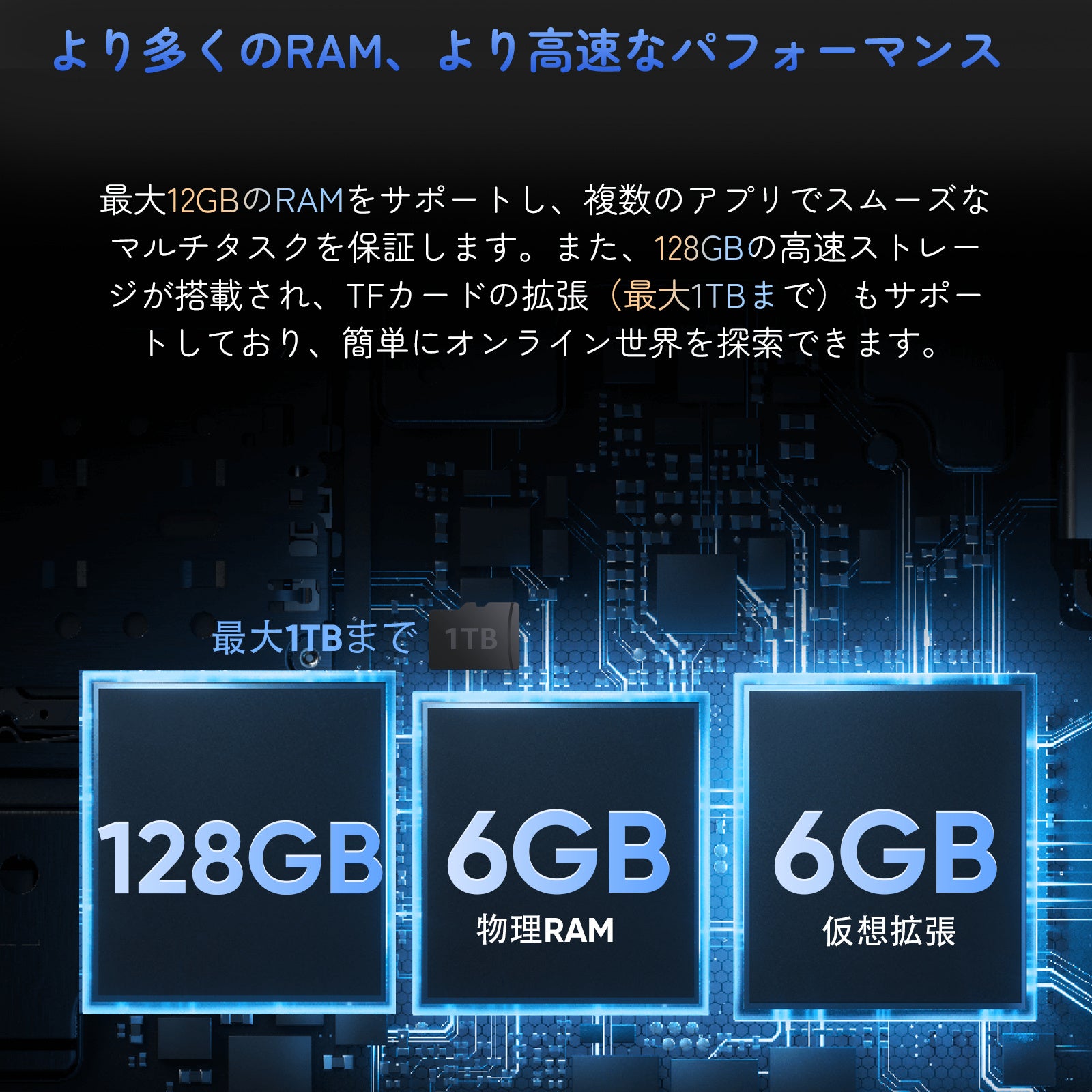 12GB(6GB+6GB拡張)+128GB+1TB拡張、6600mAhバッテリー+USB-C充電。スマートなRAMの割り当て機能で処理速度が向上し、多くのファイルを保存可能。