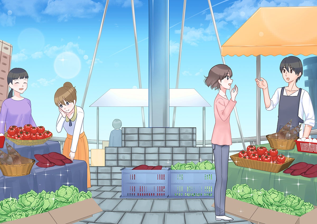 近郊の農作物が所狭しと展示されており、行き交う人が足を止めて買い物をしたり生産者と話したりできる農産物直売所