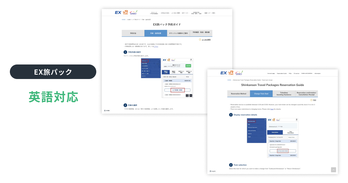 EX旅パックの開始にあたり、サービスの特徴や予約方法を紹介するページを新たに立ち上げました。同時に、開始日まで限られた期間でのページ英語対応が急務でした。