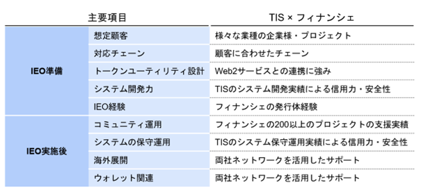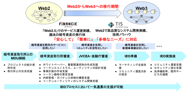 そこで、Web1・Web2のITで社会基盤を支えてきたTISと、Web2とWeb3の中間サービスを提供し、IEOの発行体としての実績を持つフィナンシェが共同で、IEO実施前後の対応を支援する「IEO支援サービス」を提供します。
