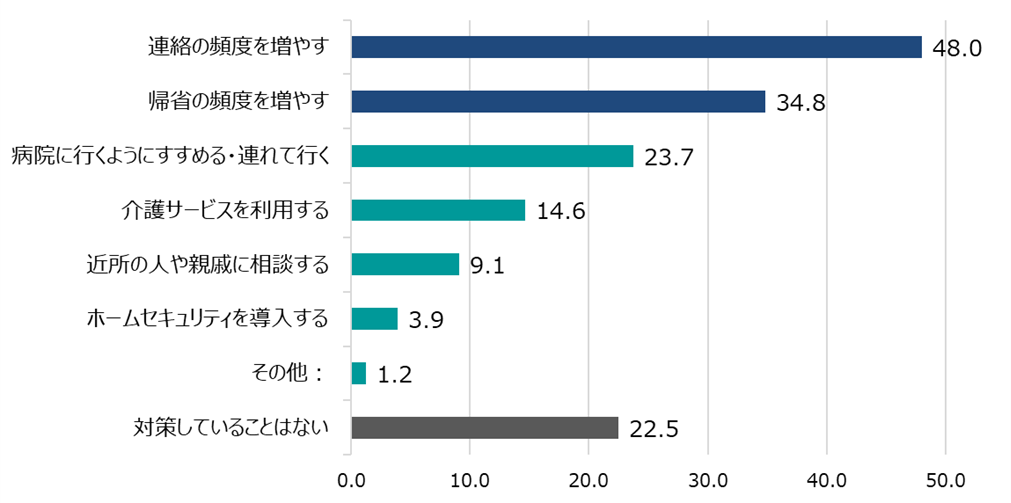 また、さまざまな不安に対して連絡や帰省の頻度を増やすなど対策をしていても、不安を解消できていない人が31.9%いることが分かりました。親とのコミュニケーション頻度を増やしながらも、離れた環境下では緊急時にすぐ駆け付けられないことから、不安要素が残ってしまうものと考えられます。